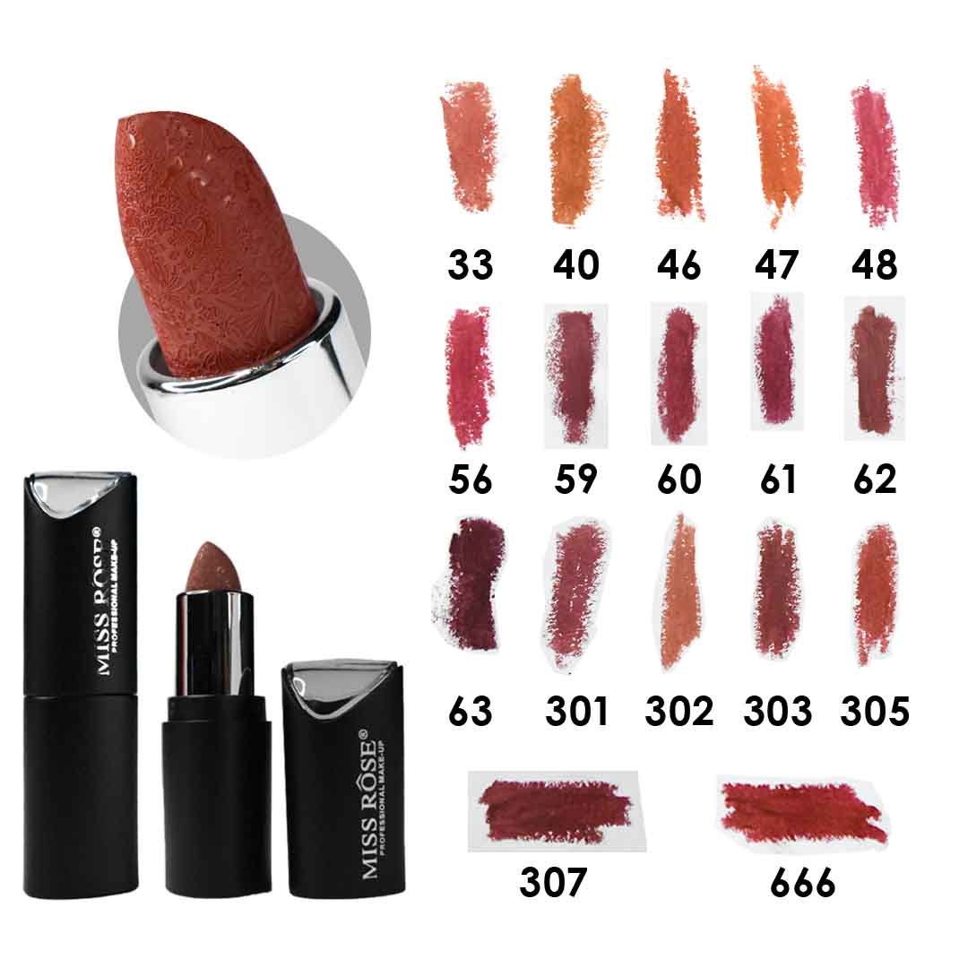 Labiales marca Miss Rose en su presentación de empaque negro son ideales para lucir un maquillaje profesional, su acabado efecto mate te brinda un acabado prolongado.